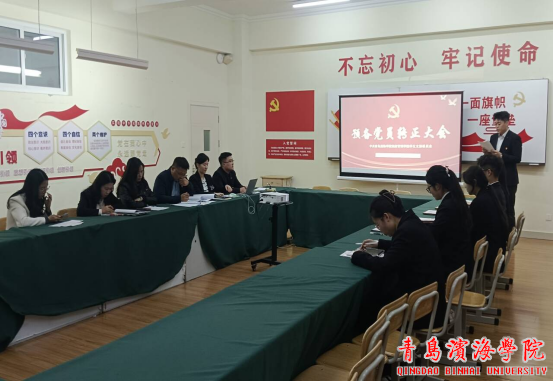 2025年11月14日18时30分,青岛滨海学院酒店管理学院学生党支部于隆德楼407室召开预备党员转正大会。本次大会旨在审议并通过王娅琳、任清源两位预备党员的转正事宜,支部全体成员参会,会议由支部书记王鑫同志主持。